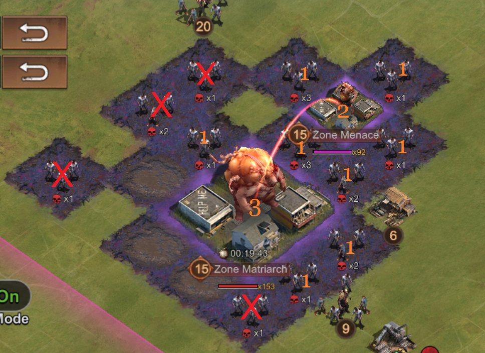 To “clear” a Plague Zone, you’ll need to defeat the Zone Matriarch in the center. But you can’t attack it directly. You’ll need to defeat the accompanying Zone Menace(s) first. And before you can attack the Zone Menace(s), you need to defeat any borderingInfected. Let’s look at a level 15 Plague Zone example. For this Plague Zone, the approximate order that you’ll need to attack is numbered 1, 2, and 3. Tip: you can save stamina by ignoring the Infected that don’t border a Menace or Matriarch (marked with a red X). If you’re clearing this plague zone with a strike team (which you should be), alliance members can each attack a different bordering Infected at the same time.