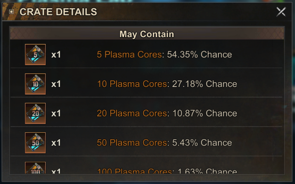 Given the crate has over 50% chance of having 5 plasma cores and only 0.54% chance of having 200 cores, these crates average around 13 plasma cores each (meaning if you open enough of these crates, your crates would average out to 13 cores per crate).